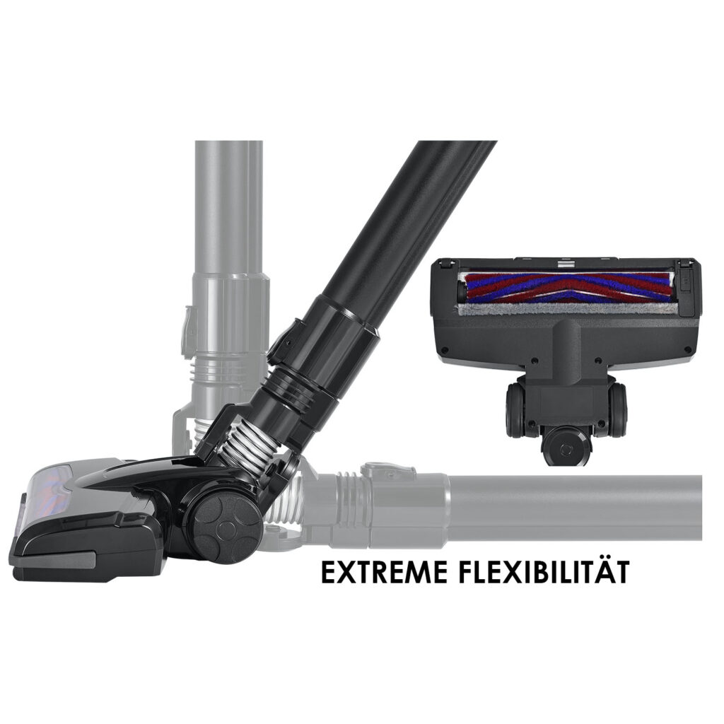 Пылесборник объемом 0,25 л заменяет дорогие мешки для пылесоса, его можно легко снять и опорожнить.Напольная светодиодная насадка со светодиодной передней подсветкой. Гибкая насадка для пола подходит для ковров и всех обычных твердых полов.