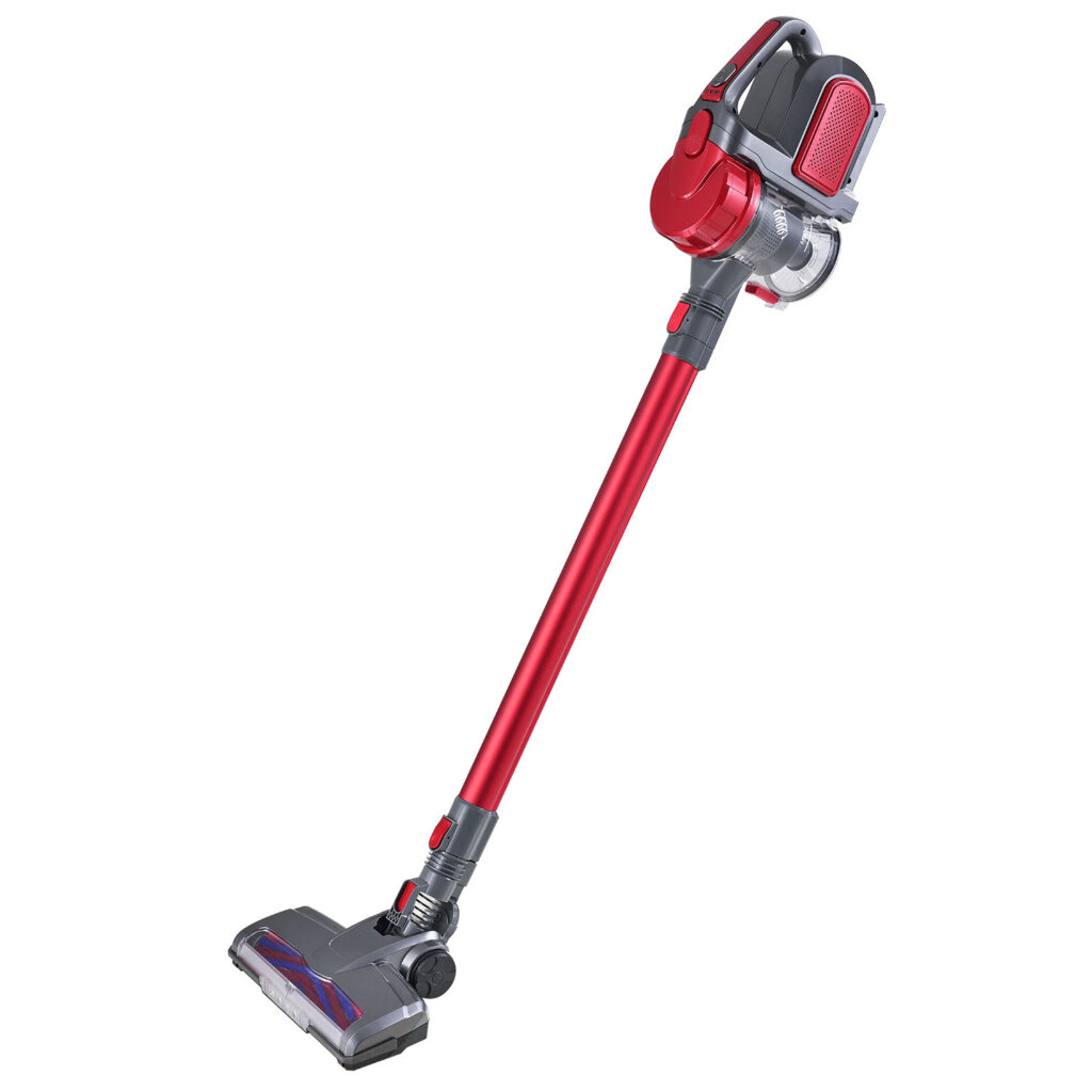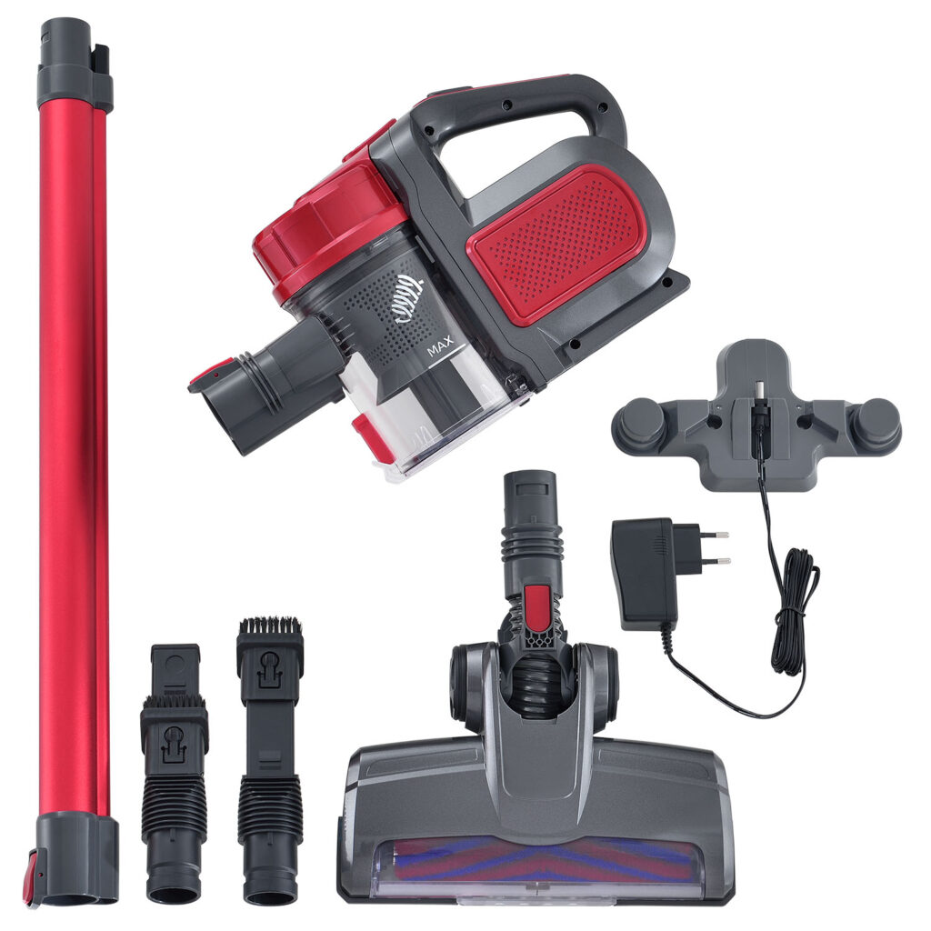 Практичный аккумуляторный пылесос 2-в-1 VAC100 Pro (красный) с настенным кронштейном, зарядной станцией и светодиодной насадкой для пола – идеальное устройство для уборки дома.