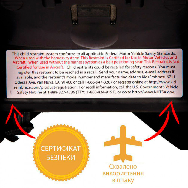 • Автокрісла KidsEmbrace відповідають Федеральному стандарту безпеки автотранспортних засобів 213 у США (FMVSS 213).