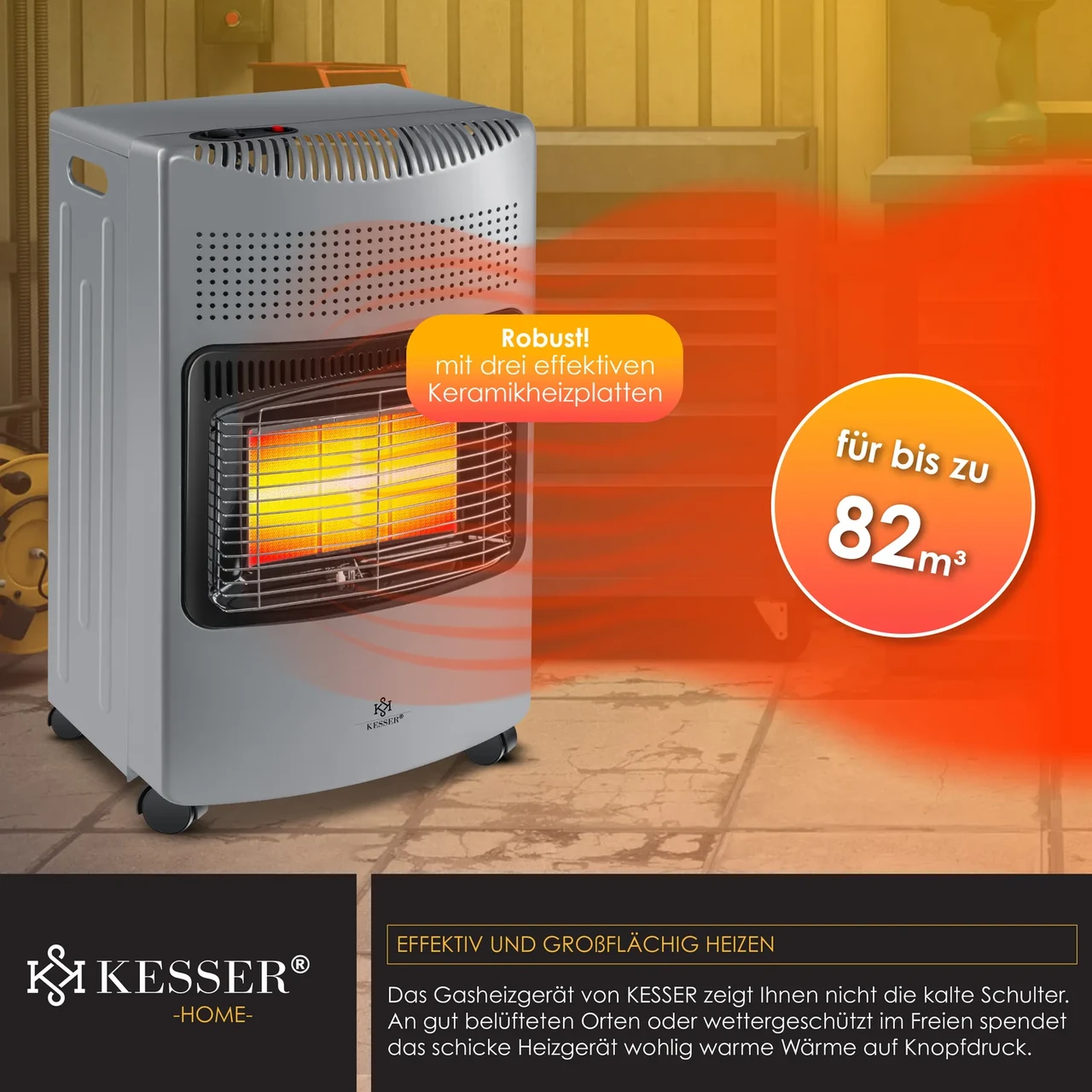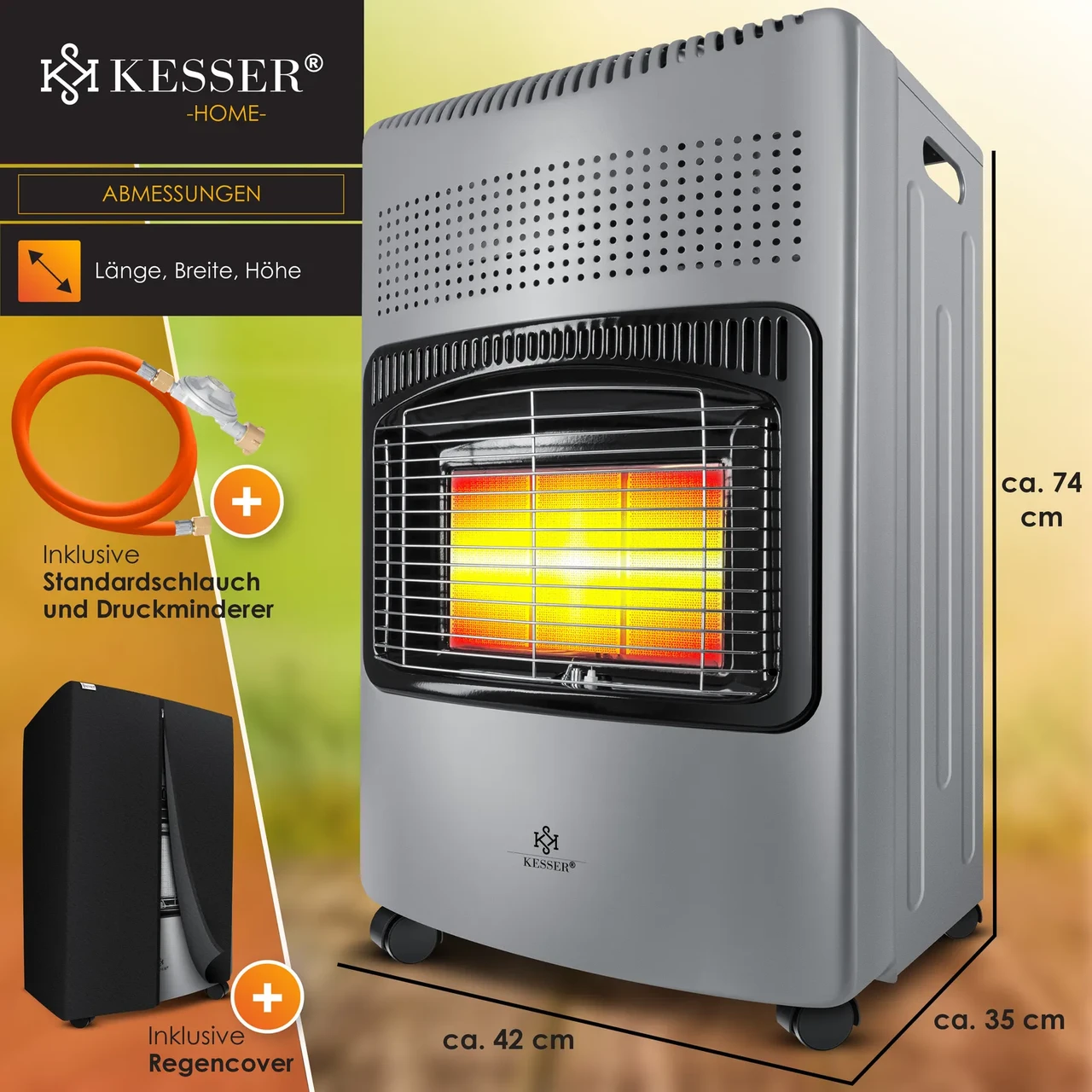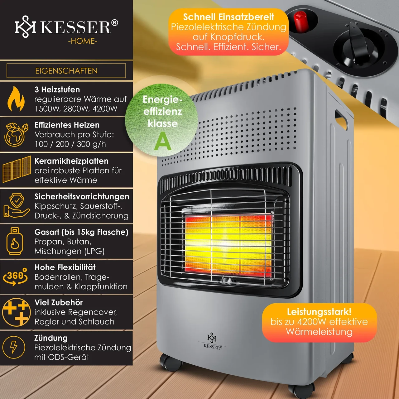 Газовий обігрівач KESSER з 3 рівнями нагріву 1500 Вт, 2800 Вт і 4200 Вт, включаючи редуктор тиску та стандартний шланг, розмір пляшки до 15 кг, п’єзоелектричний розпал з пристроєм ODS, низьке споживання, ролики для підлоги 360°