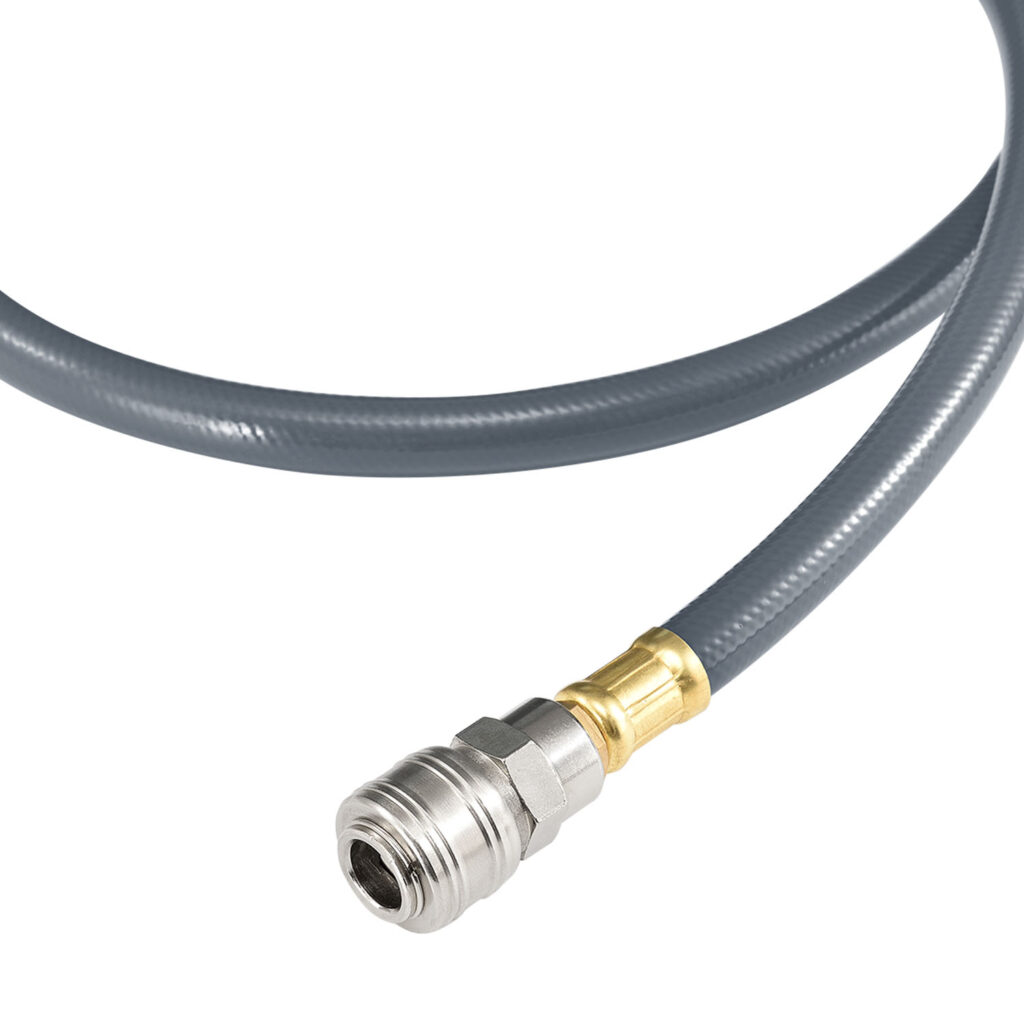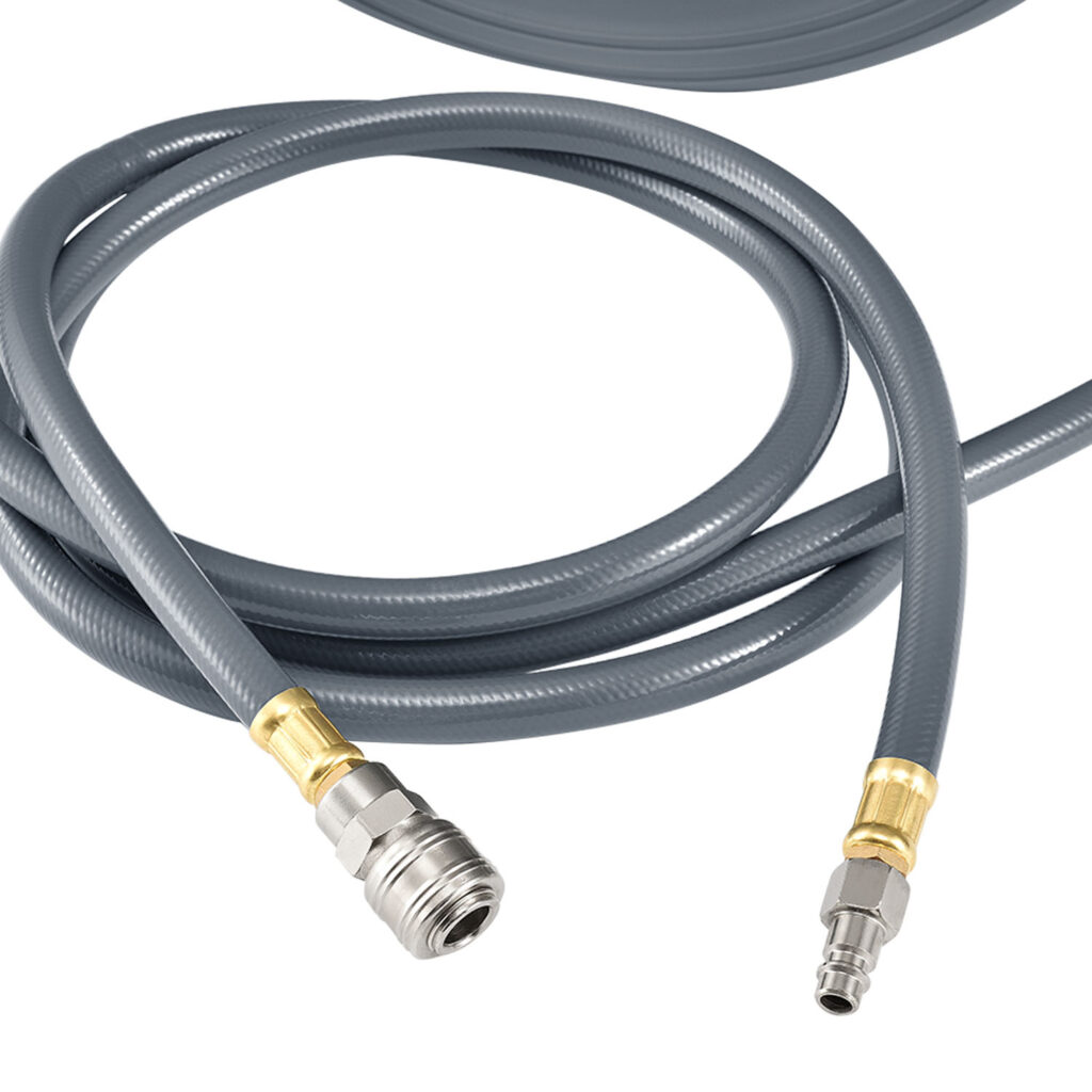Оборудованный шлангом из ПВХ длиной 20 м. Шланг для сжатого воздуха толщиной 12 мм имеет внутренний диаметр 8 мм и рассчитан на рабочее давление 8 бар.