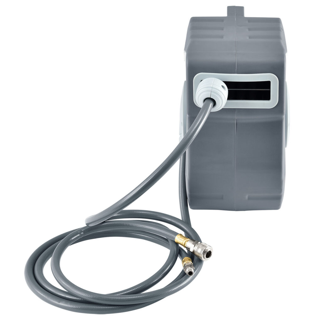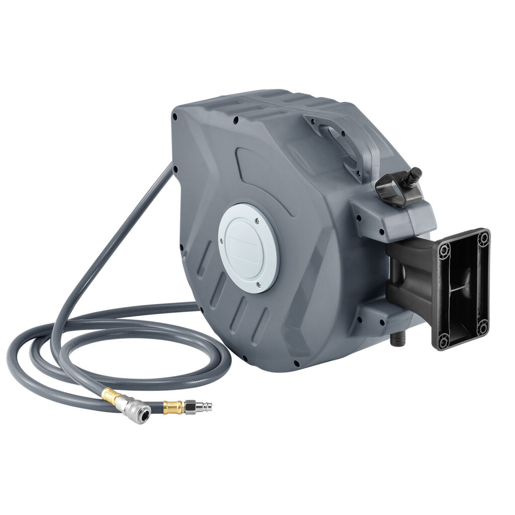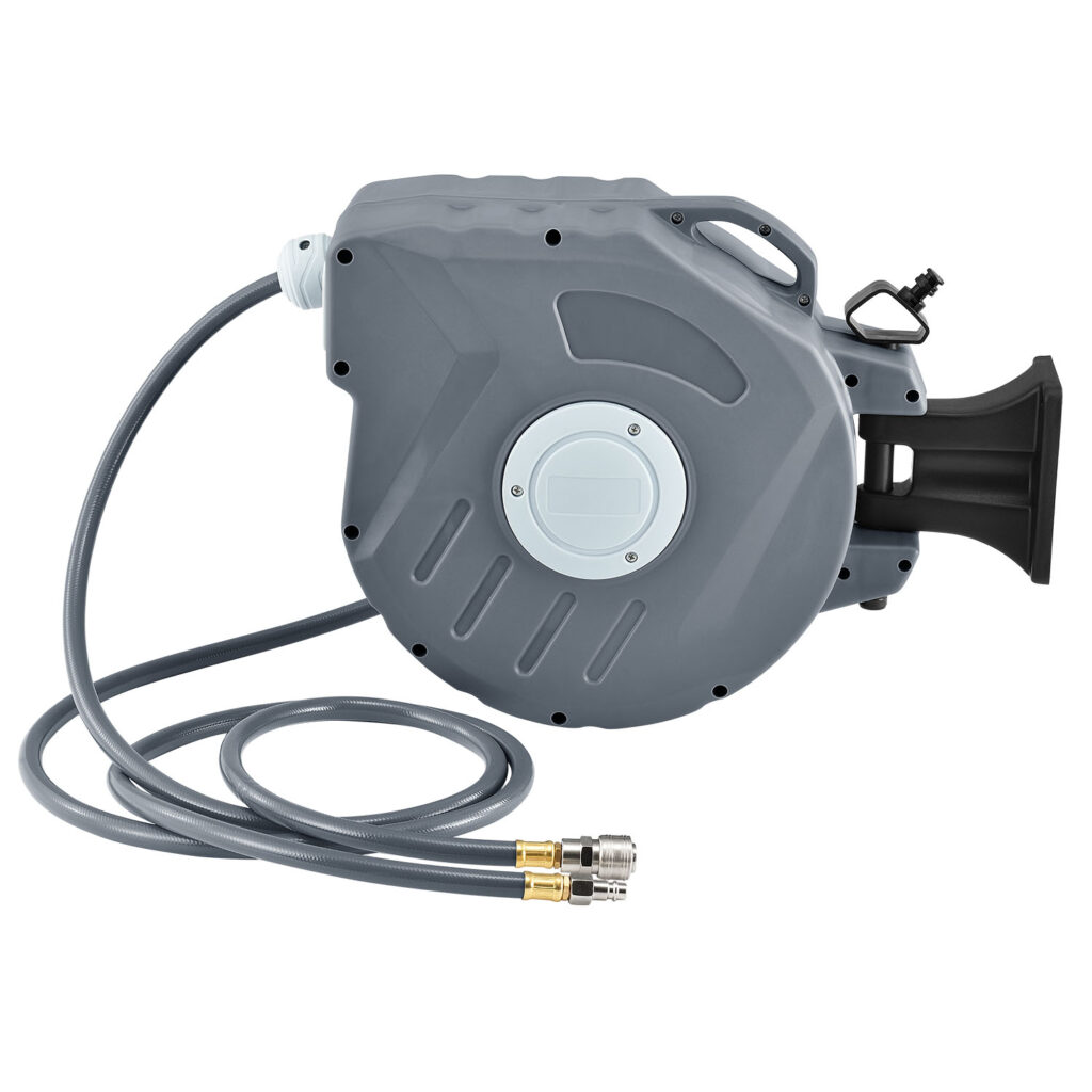 Катушка для шланга сжатого воздуха идеально подходит для подключения оборудования или инструментов к сосуду высокого давления или компрессора. После того, как работа будет сделана, можно легко сматывать шланг.