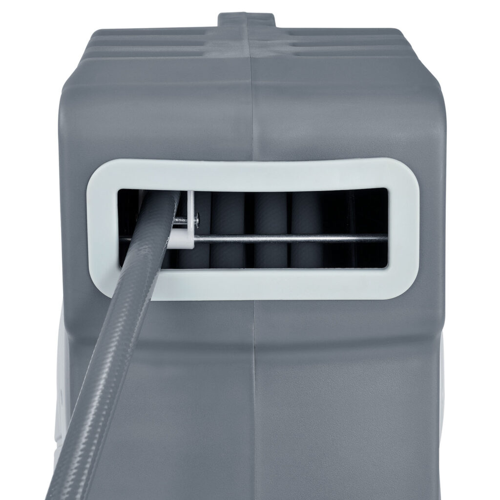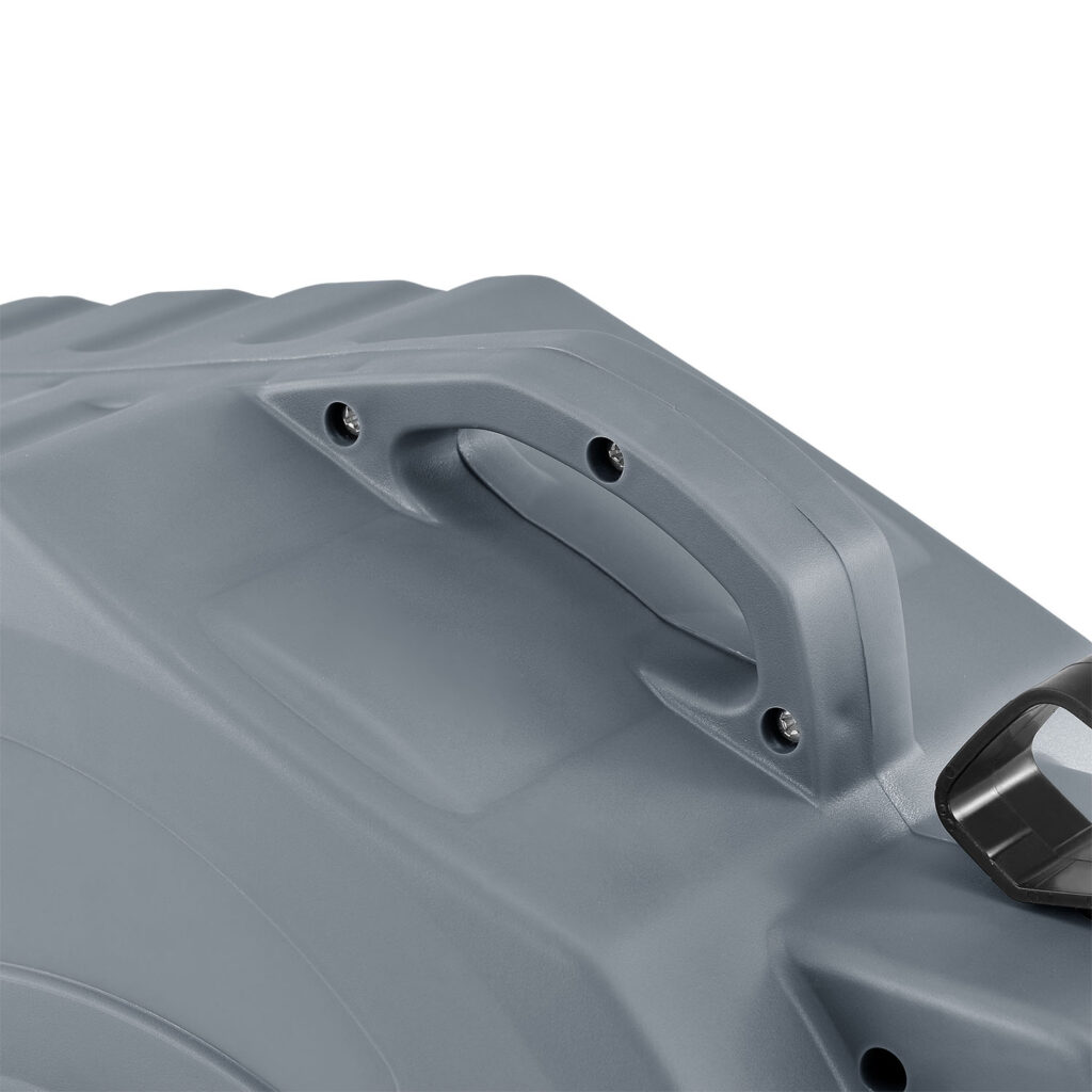 Катушка для шланга представляет собой корпус 48 × 16 × 34,3 см из полипропилена. Материал надежный и устойчивый к ультрафиолетовому излучению. Таким образом, он может выдерживать даже сложные условия.