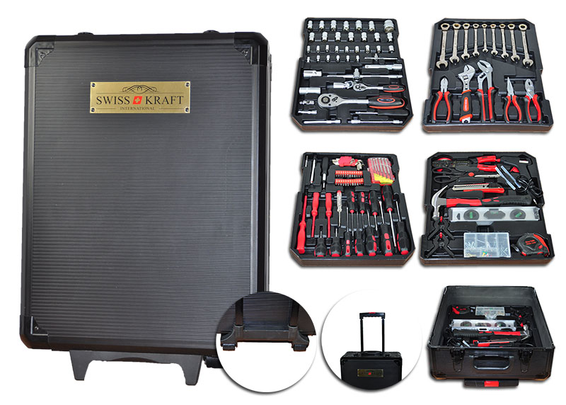 Набор SWISS KRAFT – это ваша универсальная мастерская, которая всегда с вами. Он продуман так, чтобы вы не нуждались в покупке отдельных дополнительных инструментов, а имели всё необходимое, собранное в одном месте. 399 деталей набора позволят вам быть во всеоружии в любой ситуации, при любой поломке или ремонте. Четырехуровневый чемодан предусматривает хранение инструментов в правильном логическом порядке и обеспечивает быстрый доступ к деталям, а телескопическая ручка и колёсики на корпусе чемодана, позволят легко и быстро его транспортировать. Углы корпуса дополнительно защищены металлическими накладками, что позволяет защитить его от ударов и надолго сохранить первозданный вид чемодана.