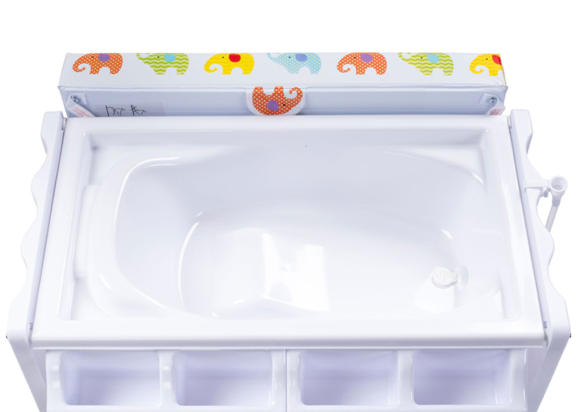 – простая трансформация пеленального столика в столик с ванночкой для купания, которая расположена непосредственно под пеленальной поверхностью. Для проведения водных процедур матрасик опускается в сторону, где он свисает на специальных креплениях;