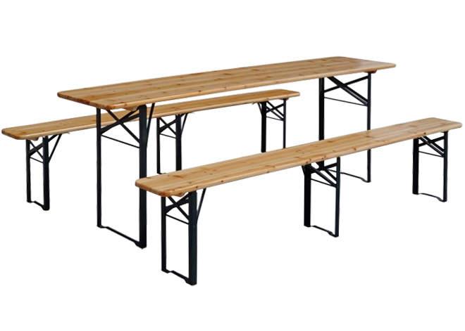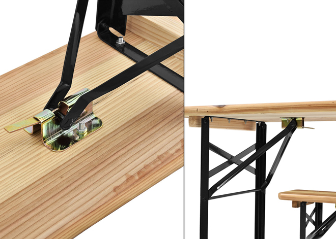 Главными достоинствами данного набора садовой мебели является прочность, простота и универсальность. Он может использоваться для любых мероприятий на открытом воздухе: в саду, в парке, на общественных мероприятиях и массовых застольях, а также использоваться в летних кафе и на открытых террасах. Складная конструкция стола и лавок предусматривает удобное хранение вне периода использования. Мощные защёлки-фиксаторы у основания крепления ножек обеспечивают сабильность конструкции. Мебель изготовлена из качественных материалов: рама выполнена из стали с порошковым покрытием, а сиденья – из сосновой древесины, покрытой защитным лаком.