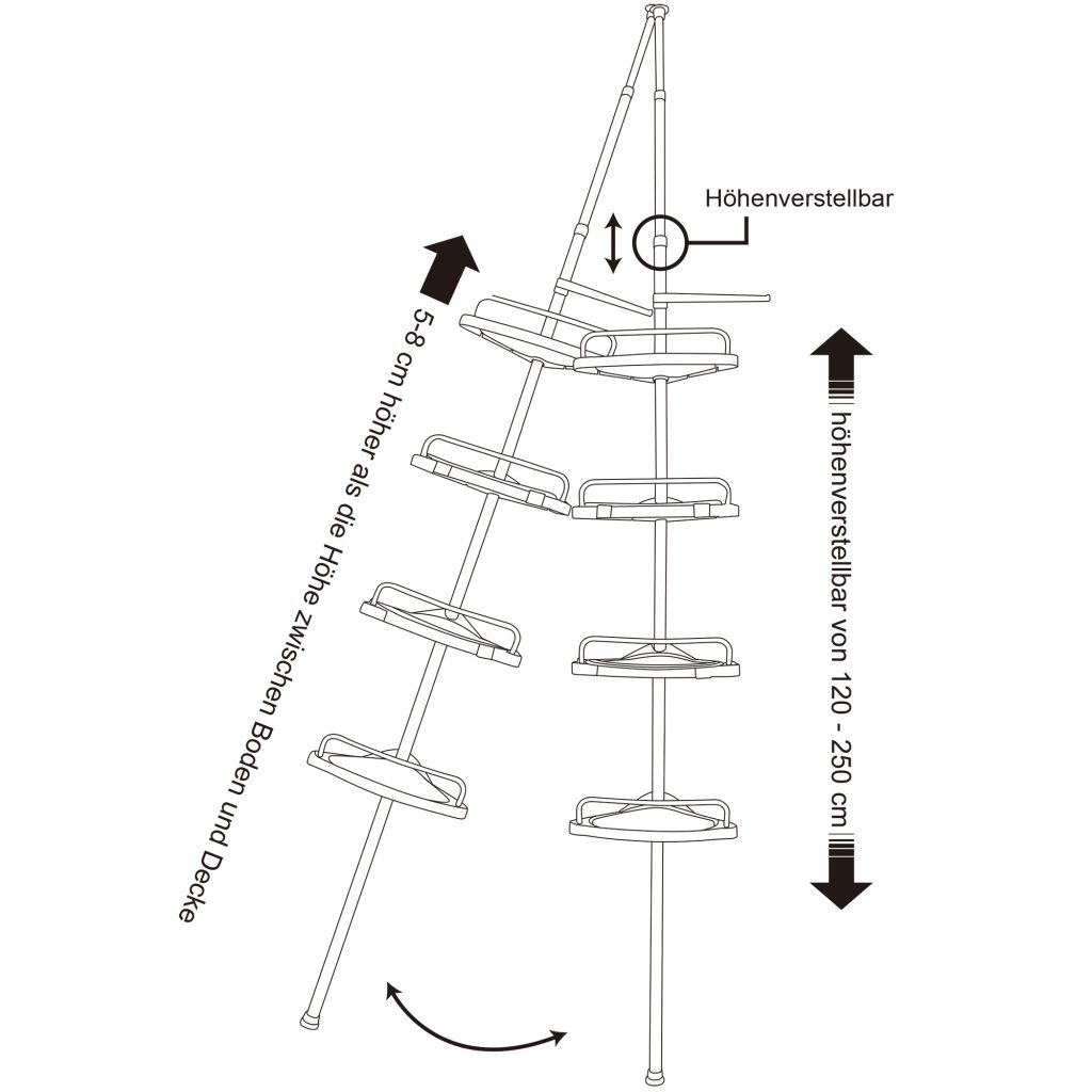 Високоякісний телескопічний душовий стелаж із нержавіючої сталі універсально застосовується у душових кабінах, ваннах та кутах. Практична кутова полиця має місце для зберігання шампуню, мила, губки та іншого лазневого приладдя.