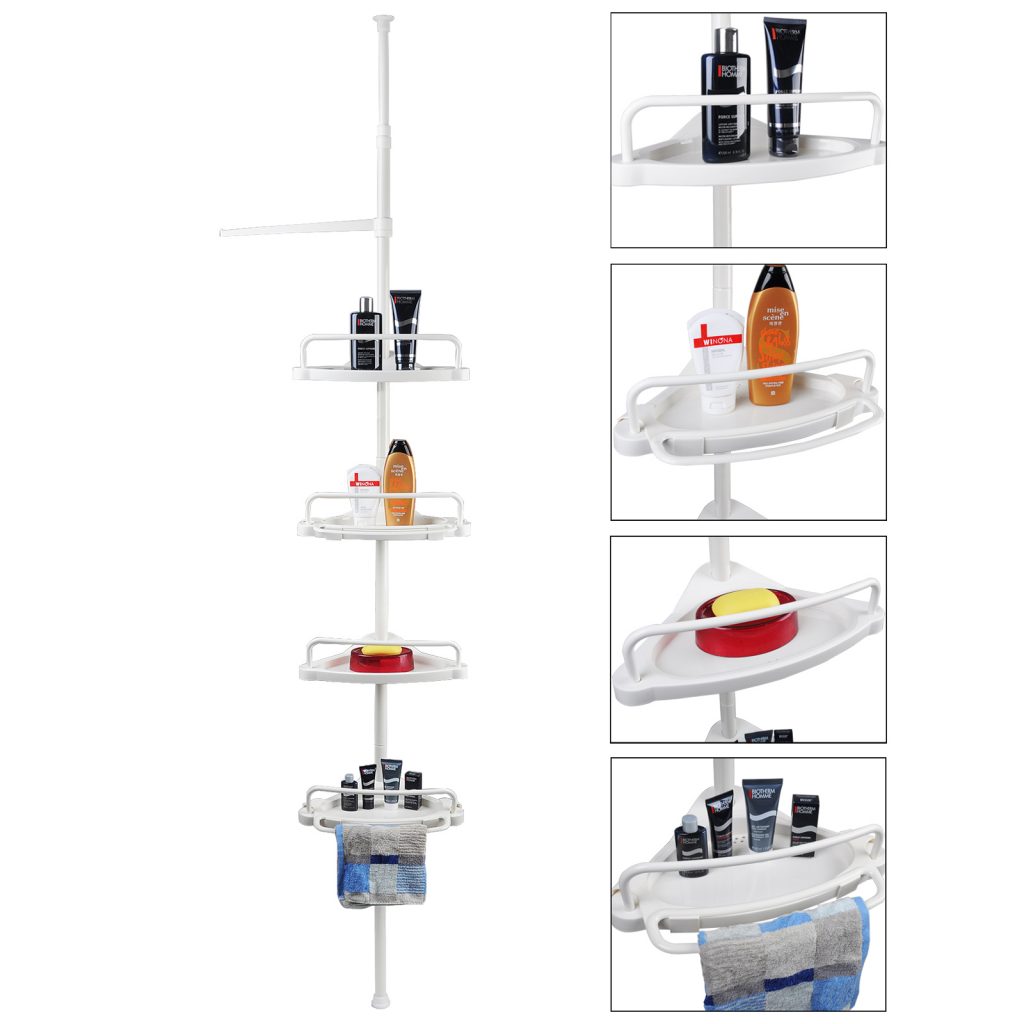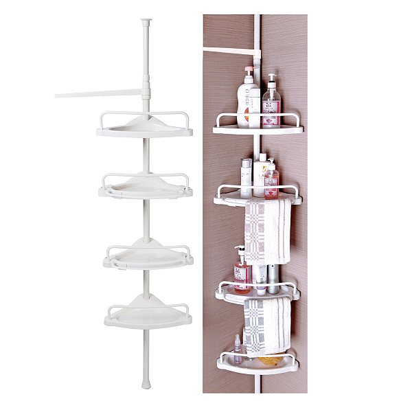 Високоякісний телескопічний душовий стелаж із нержавіючої сталі універсально застосовується у душових кабінах, ваннах та кутах. Практична кутова полиця має місце для зберігання шампуню, мила, губки та іншого лазневого приладдя.