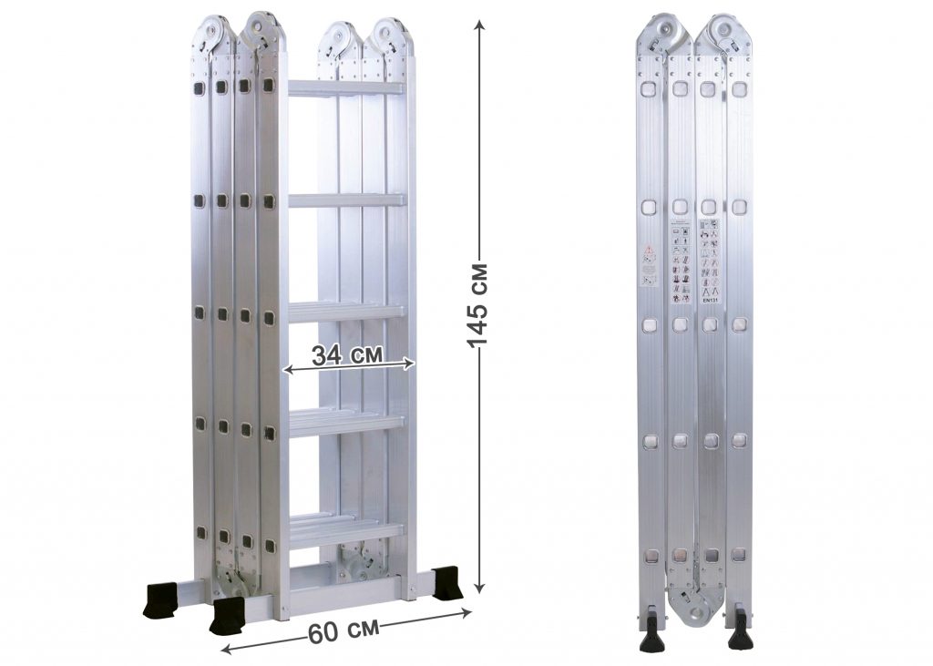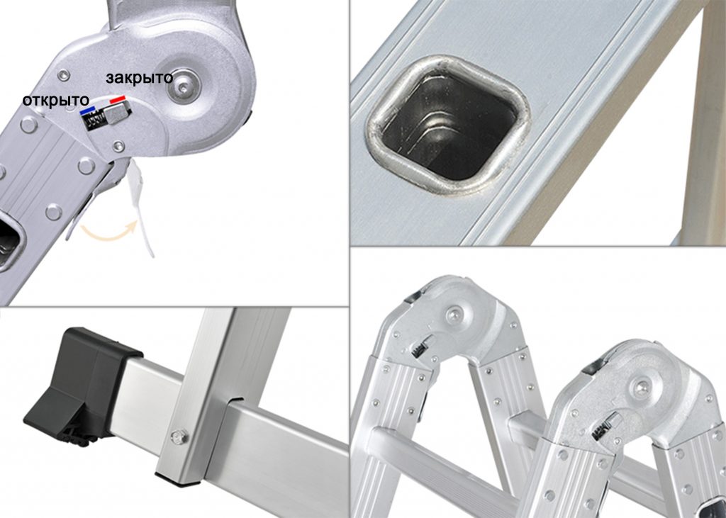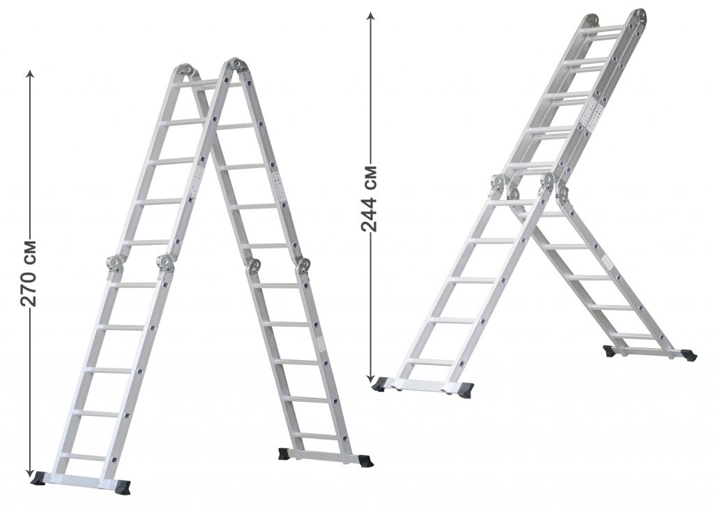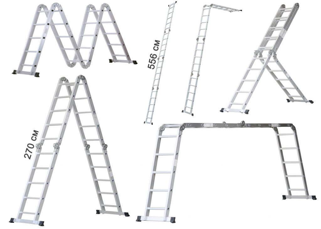 Самая универсальная стремянка из всех существующих. Двусторонняя лестница, приставная лестница, две отдельных двусторонних лестницы, рабочая платформа (козлы), выдвижная лестница – сложно представить, что всё это можно получить из алюминиевой конструкции. Подумать только: весь этот «арсенал» свободно помещается в багажнике автомобиля, на балконе, и даже в кладовом шкафу квартиры. Ремонт, строительне, монтажные, малярные , отделочные работы будут выполняться в разы легче и приятнее, если у вас есть такой незаменимый агрегат. Стремянку с лёгкостью сможет переносить даже один человек, без чьей-либо помощи, а простота в сборке только подтвердит правильность вашего выбора.