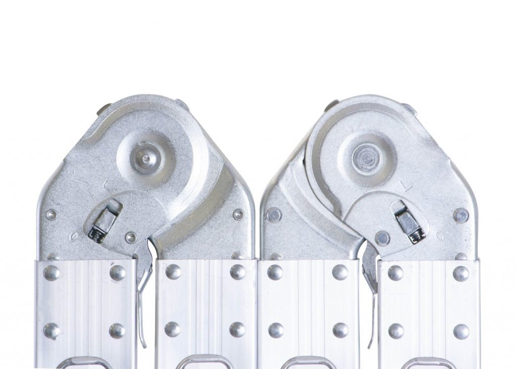 Шарнирная стремянка выдерживает вес до 150 кг. Прорезиненные ножки обеспечивают прочную опору. Широкие ступени с противоскользящим профилем предотвращают скольжение и обеспечивают надежное удержание. Соединительная система с предохранительным замком придает многофункциональной лестнице стойкость.