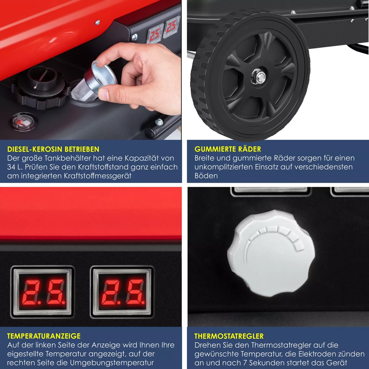 Перевага Опис ✅ Потужність 30 кВт Обігріває площу до 290 м² ✅ Потік повітря 750 м³/год – швидке прогрівання ✅ Робота на дизелі/гасі Економічна витрата – ~2,4 кг/год ✅ Цифровий термостат Точне завдання температури ✅ Подвійний дисплей Показує встановлену та поточну температуру ✅ Електродний розпал Швидкий запуск за 7 секунд ✅ Захист Від перегріву, полум’я та випадкового запуску ✅ Зручність транспортування Ручка + прогумовані колеса Ø 20 см ✅ Міцний корпус Нержавіюча сталь, стійка до нагрівання ✅ Призначення Для приміщень, теплиць, наметів, ферм, будмайданчиків ⚙️ Технічні характеристики: