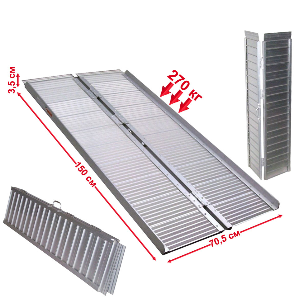 Прочная и стабильная рампа изготовлена из лёгкого алюминиевого листа. Она удобно складывается и занимает не много пространства при хранении. С её помощью можно удобно и легко загружать на возвышенность такие виды транспорта, как велосипед, мотоцикл, мопед, скутер, квадроцикл, а также крупную технику и т.д. Рампа предназначена как для мобильного использования, так и для стационарной установки. Конструкция позволяет выдерживать объекты весом до 270 кг, а перфорированная поверхность обеспечивает хорошее сцепление, благодаря чему техника будет загружена быстро и безопасно. Дополнительной статичности придаст нескользящая контрольная пластина. Трап имеет алюминиевую ручку для удобной транспортировки.