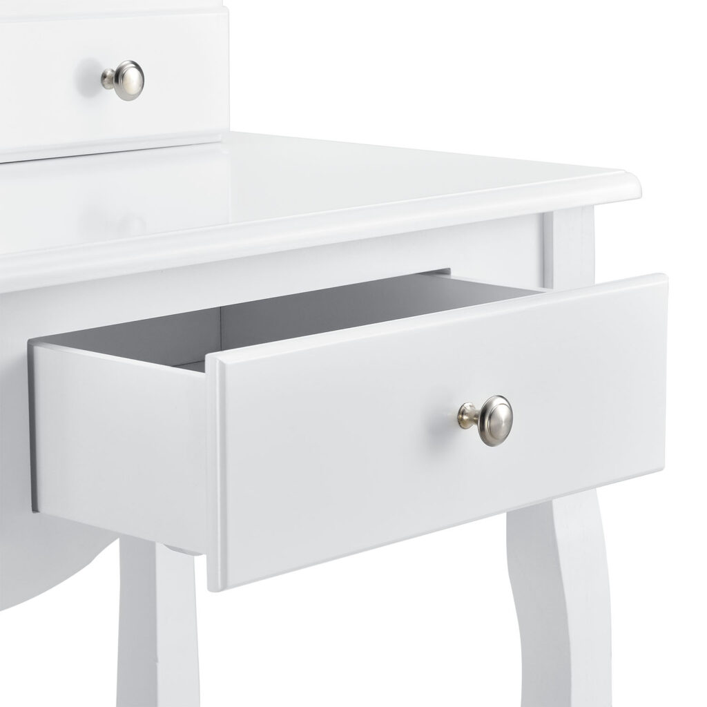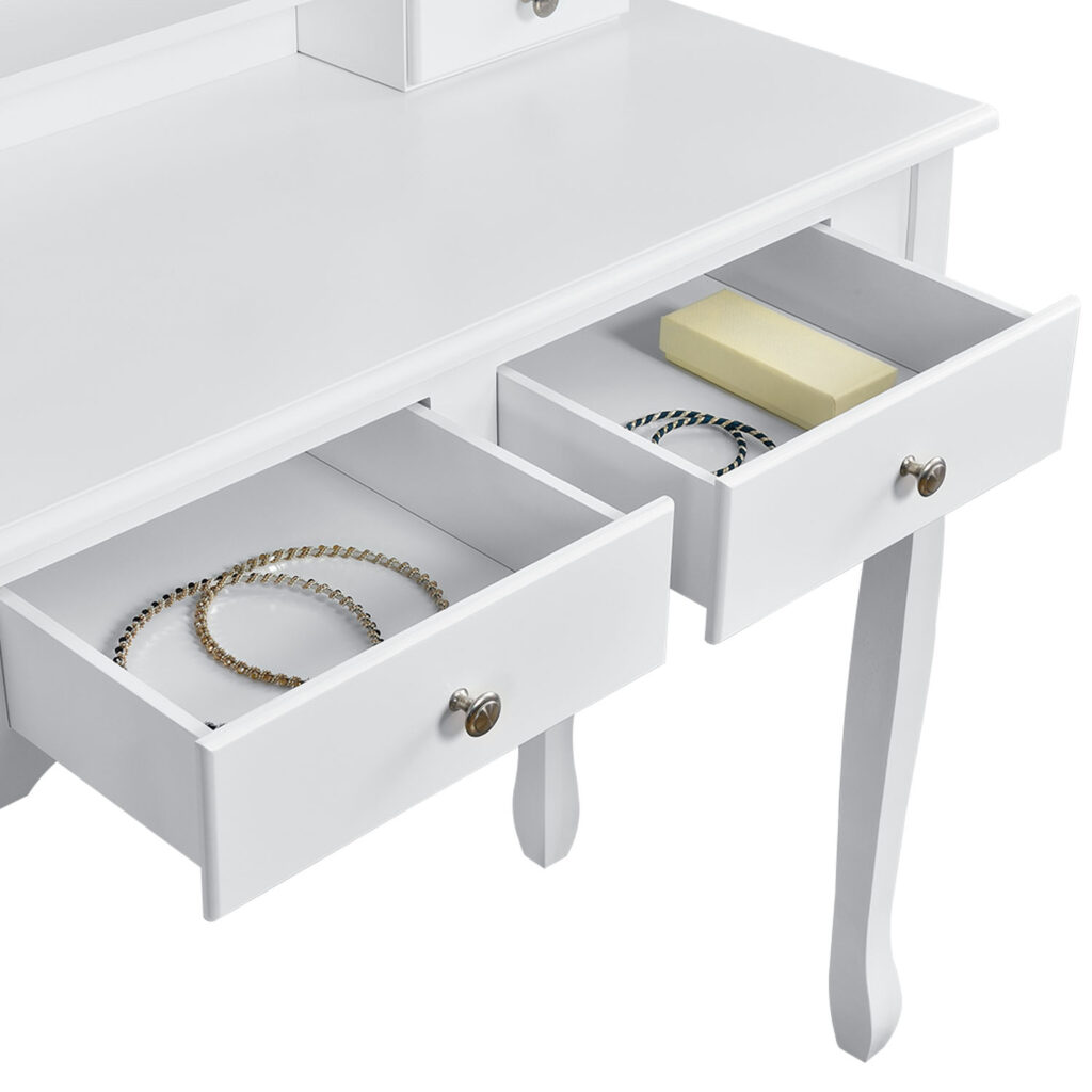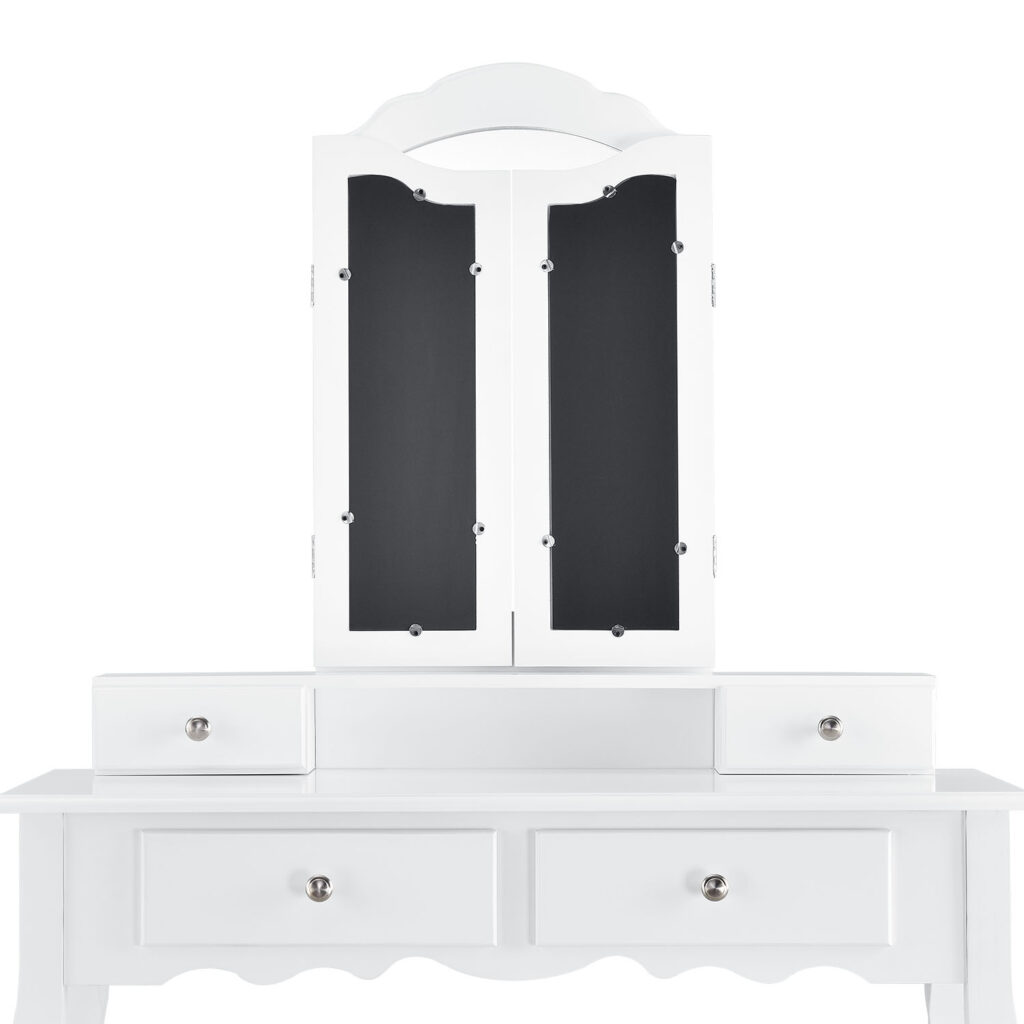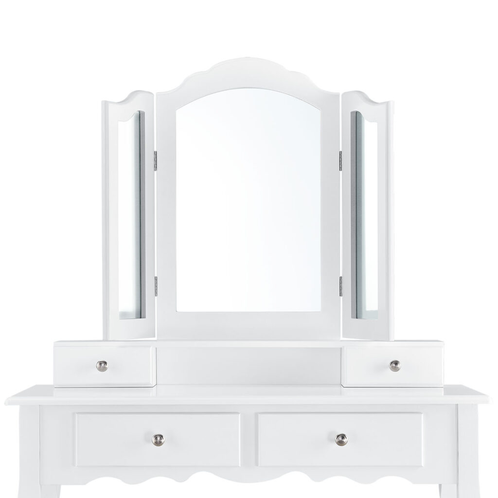 Велике дзеркало з двома зовнішніми крилами, що складаються. Косметичний столик обладнаний чотирма висувними ящиками – два ящики в столі та ще два в приставці для дзеркала. Вони мають багато місця для зберігання кистей, косметики та інших аксесуарів.
