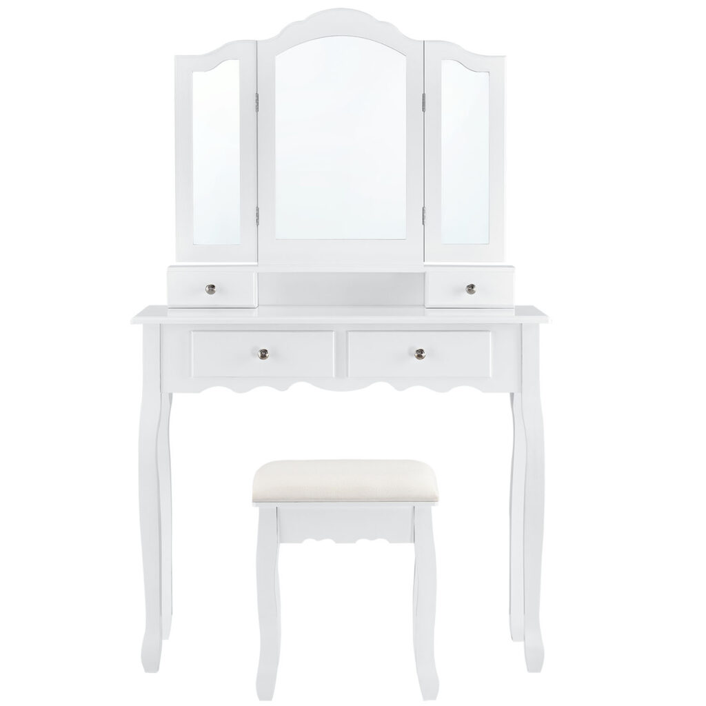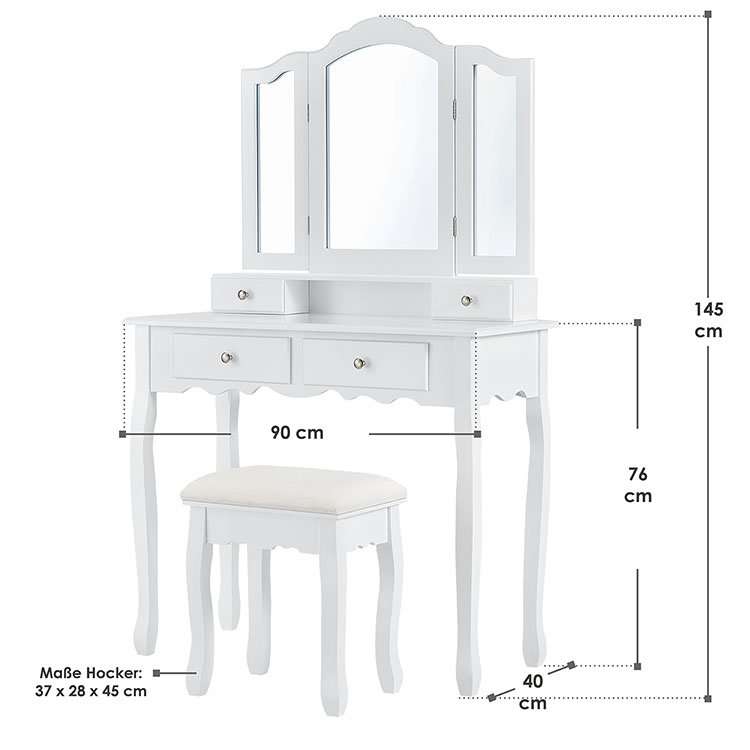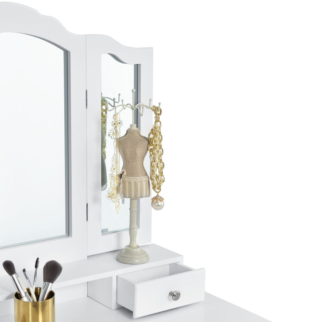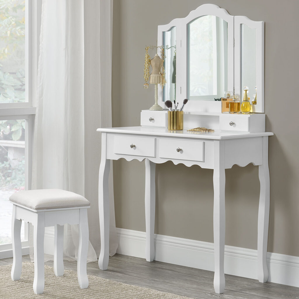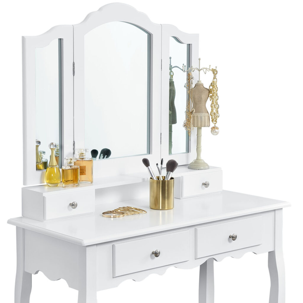 Велике дзеркало з двома зовнішніми крилами, що складаються. Косметичний столик обладнаний чотирма висувними ящиками – два ящики в столі та ще два в приставці для дзеркала. Вони мають багато місця для зберігання кистей, косметики та інших аксесуарів.