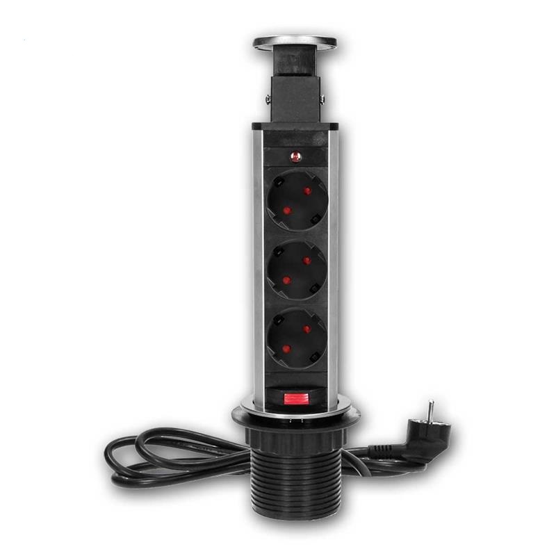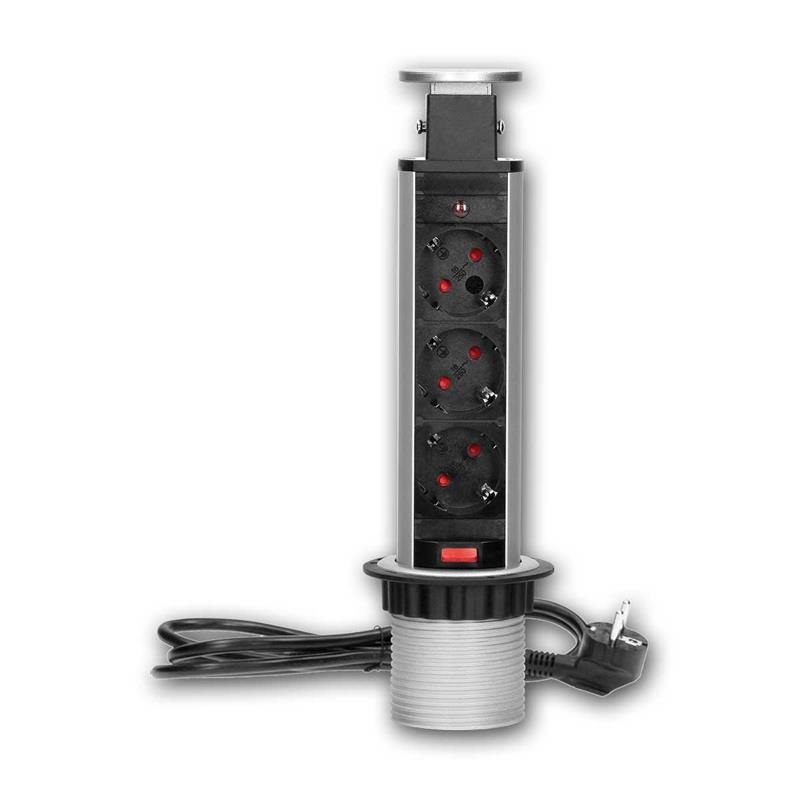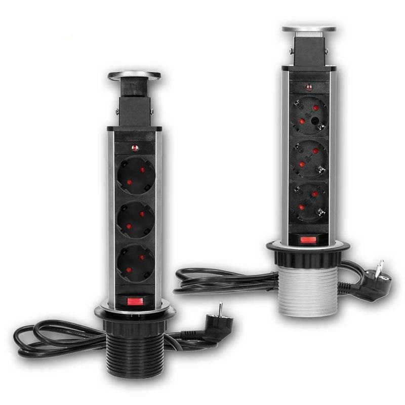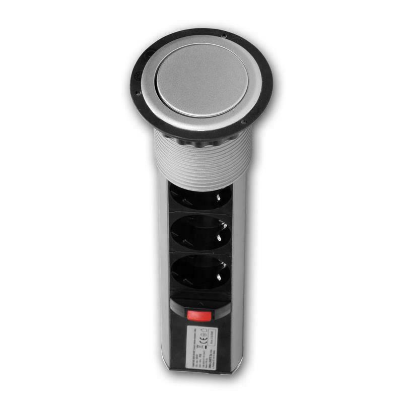 Простым нажатием на крышку силовая башня поднимается. Стопор предотвращает скольжение во время использования. Если блок питания больше не требуется, вся планка опускается заподлицо со столешницей – это обеспечивает порядок и пространство. Соединительный кабель длиной около 1,8 метра с защитной вилкой обеспечивает подключение к ближайшей розетке.